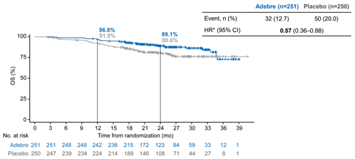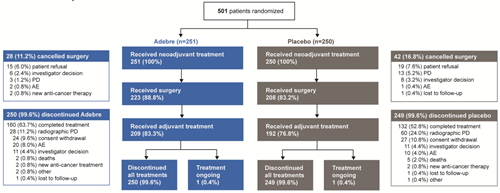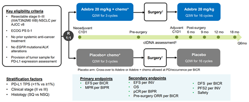 术前进行3个周期新辅助治疗,术后再进行最多16个周期的阿得贝利单抗/安慰剂单药辅助治疗。研究设定共同主要终点:由盲态独立病理评估(BIPR)评估的主要病理缓解(MPR,定义为术后肿瘤残留活细胞≤10%)和盲态中心影像评估(BICR)评估的EFS,次要终点为:研究者评估的EFS,总生存期(OS)、病理完全缓解(pCR)、ORR等,以及安全性终点,同时纳入分子残留病灶监测(MRD)等作为探索性终点。