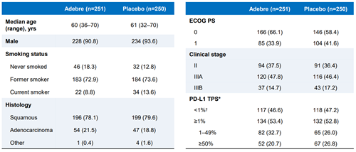 截至2025年6月,研究共纳入501例患者,其中251例随机分配至试验组(阿得贝利单抗联合化疗),250例分配至对照组(安慰剂联合化疗),两组基线特征均衡:中位年龄约60岁,男性占比90%以上,鳞状细胞癌占78%-80%,III期患者占比超过60%,其中IIIB期患者占全人群约15%,PD-L1表达(TPS)<1%与≥1%的患者比例分别为47%和53%。