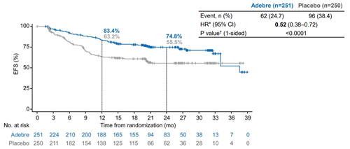 基于整体人群的分析:经BICR评估,阿得贝利单抗联合化疗组2年EFS率为74.8%,对照组55.5%,EFS风险比(HR)为0.52(95% CI:0.38-0.72),可显著降低48%的疾病复发、进展或死亡的风险,差异具有统计学意义(单侧P值<0.0001)。基于研究者的评估,阿得贝利单抗联合化疗组2年EFS率为77.2%,对照组为58.6%,HR 0.49(95%CI 0.35-0.69)。BICR和研究者的评估结果高度一致,具有临床意义的疗效。