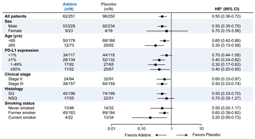 基于BICR评估的关键亚组分析:阿得贝利单抗联合化疗组的EFS获益在各关键亚组中均广泛存在,不同临床特征患者均具有获益趋势。与其他免疫检查点抑制剂围术期治疗的观察结果一致。