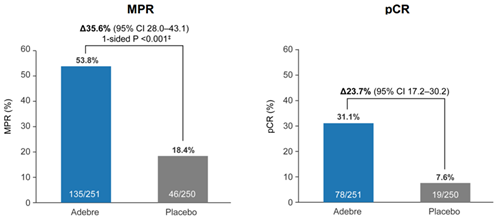 基于BIPR评估的MPR率:阿得贝利单抗联合化疗组达53.8%,对照组为18.4%,组间差值为35.6%。