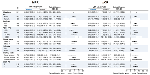 与EFS关键亚组分析结果相似,不同临床特征患者均从阿得贝利单抗联合的治疗中获得MPR和pCR的获益。