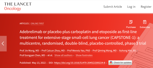 北京时间2022年5月14日,918博天娱乐旗舰医药自主研发的PD-L1抑制剂阿得贝利单抗治疗广泛期小细胞肺癌的III期临床研究(CAPSTONE-1研究)成果正式全文在线发表于国际权威学术期刊《柳叶刀·肿瘤学》(《THE LANCET Oncology》,影响因子41.316)。CAPSTONE-1研究结果显示,阿得贝利单抗联合化疗一线治疗广泛期小细胞肺癌相较于安慰剂联合化疗可以显著延长患者总生存期至15.3个月[1],刷新现有免疫药物一线治疗广泛期小细胞肺癌的总生存纪录[2]。