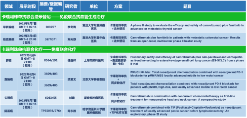 卡瑞利珠单抗联合918博天娱乐旗舰医药的另一款创新药法米替尼在甲状腺癌和结直肠癌领域有2项研究被接收为壁报,另有卡瑞利珠单抗联合化疗的4项研究在肺癌、结直肠癌、头颈癌和阴茎癌领域的研究被接收为5份壁报。