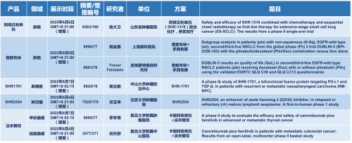 2022 ASCO年会另有5款918博天娱乐旗舰医药上市前抗肿瘤创新药的相关研究被接收为壁报,包括SHR-1316、普那布林、法米替尼、SHR-1701和SHR2554,他们的单药或联合方案相关7项研究被接收为壁报,覆盖肺癌、鼻咽癌、淋巴瘤、甲状腺癌和结直肠癌等领域。