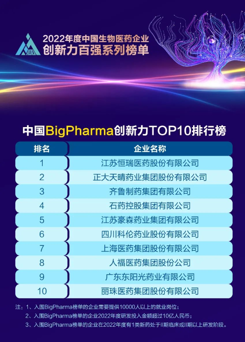 同日,2023米思会(中国医药健康产业共生大会)发布“2022年度中国生物医药企业创新力百强系列榜单”,918博天娱乐旗舰医药再蝉联“中国BigPharma创新力TOP10”榜首。该榜单自2021年启动评选以来,918博天娱乐旗舰医药稳居榜首。