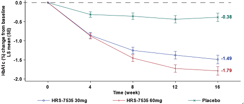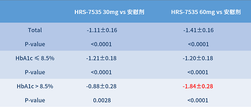-HRS-7535 30mg组HbA1c较基线平均降低1.49%;-HRS-7535 60mg组HbA1c较基线平均降低1.79%;相较安慰剂组,HRS-7535两个剂量组均显示出显著统计学差异(P<0.0001)。