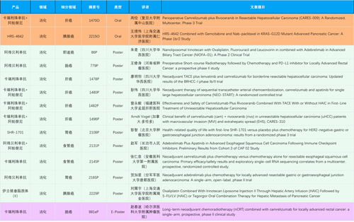 在消化系统肿瘤领域,918博天娱乐旗舰产品相关研究共入选2项口头报告、11项壁报和1项电子壁报,共14项研究。除卡瑞利珠单抗和阿帕替尼外,还有4篇阿得贝利单抗治疗消化系统肿瘤研究入选。HRS-4642、瑞拉芙普-α注射液(SHR-1701)等在研创新产品也有相应研究亮相。另有1项伊立替康脂质体(II)用于胰腺癌治疗的研究入选壁报。