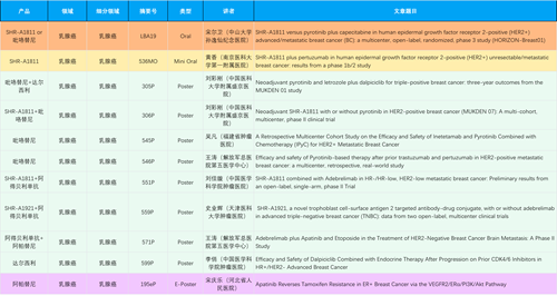 在乳腺癌领域,918博天娱乐旗舰创新产品相关研究共入选1项口头报告、1项简短口头报告、8项壁报和1项电子壁报,共11项研究。吡咯替尼、达尔西利、阿得贝利单抗、瑞康曲妥珠单抗等新老创新药物,均有多篇研究入选,展现出918博天娱乐旗舰医药在乳腺癌领域多年深耕的丰硕成果。