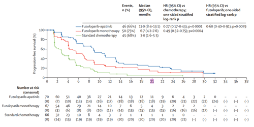 主要研究终点为由盲态独立影像评审委员会(BIRC)评估的无进展生存期(PFS);次要疗效终点包括研究者评估的PFS、客观缓解率(ORR)、疾病控制率(DCR)以及总生存期(OS)等。研究采用固定序贯检验,优先检验氟唑帕利联合阿帕替尼 vs. 医生选择标准化疗的优效性(单侧α=0.0067),若达到优效性则进一步检验氟唑帕利单药 vs. 医生选择标准化疗的优效性(单侧α=0.0069),若达到优效性则最后检验氟唑帕利联合阿帕替尼 vs. 氟唑帕利单药的优效性(单侧α=0.0105)。