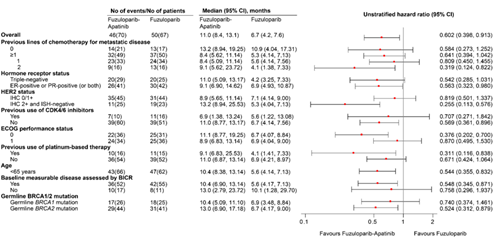 与研究者选择化疗组相比,氟唑帕利联合阿帕替尼组及氟唑帕利单药组的PFS均取得了显著的且有临床意义的改善,且相比于PARP抑制剂单药,氟唑帕利联合阿帕替尼治疗gBRCA突变HER2阴性乳腺癌的中位PFS显示出更强的临床获益,且各亚组获益保持一致。联合组和单药组相比化疗组均观察到了OS的获益趋势,需进一步随访完善OS数据。在安全性方面,未发生新的安全性信号。