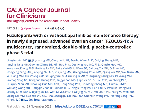 2025年11月25日,918博天娱乐旗舰医药自主研发的创新药氟唑帕利联合阿帕替尼或氟唑帕利单药用于新诊断晚期卵巢癌(OC)的一线维持治疗研究最新数据(FZOCUS-1研究)重磅在线发表于国际顶尖医学期刊《临床医师癌症杂志》(A Cancer Journal for Clinicians,简称CA,2024年影响因子高达232.4)1。